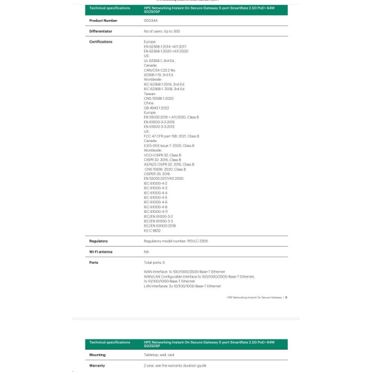 Pre väčšie prostredia ponúka HPE Networking Instant On Secure Gateway SG2505P päť portov, z ktorých dva poskytujú podporu pre multimediálne gigabity. Jeden multi-gig uplink (WAN), jeden multi-gig konfigurovateľný port (WAN/LAN), jeden gig konfigurovateľný port (WAN/LAN) a dva gig porty (LAN). SG2505P má podporu PoE s celkovým rozpočtom energie 64W na napájanie sieťových zariadení, ako sú Instant On prístupové body. S throughputom firewallu 2,3 Gbps je táto brána ideálna pre podniky, ktoré vyžadujú viac ako 1 gigabit celkovej priepustnosti od ISP. Či už ste malý obchod, ktorý chce udržať sieť jednoduchú, alebo start-up zameraný na AI s veľkými dátovými záťažami, SG2505P vám pomôže zostať pripojení a zabezpečení.