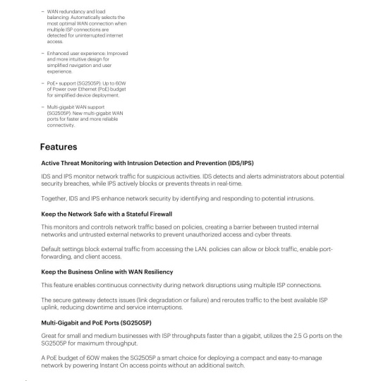 HPE Networking Instant On Secure Gateways poskytujú širokú škálu pokročilých technických funkcií navrhnutých na zvýšenie výkonu siete a zlepšenie bezpečnosti pre SMB. Jednou kľúčovou funkciou je VPN, ktorá zabezpečuje šifrovanú komunikáciu medzi miestami cez Instant On Secure Gateway, čo umožňuje podnikom bezpečne prepojiť viacero lokalít. Okrem toho, zabudovaný systém na detekciu a prevenciu narušení (IDS/IPS) aktívne monitoruje sieťovú prevádzku na podozrivé aktivity a automaticky blokuje škodlivý obsah, čím zabezpečuje integritu obchodných dát. A s automatickými aktualizáciami firmvéru, ktoré udržiavajú bezpečnostné záplaty aktuálne, a s ľahko použiteľným správou cez cloudový portál Instant On a mobilnú aplikáciu, je správa bezpečnejšej siete jednoduchšia než kedykoľvek predtým. Brána tiež podporuje odolnosť WAN cez funkcie failover, čo zabezpečuje plynulú prevádzku siete aj počas výpadkov ISP.