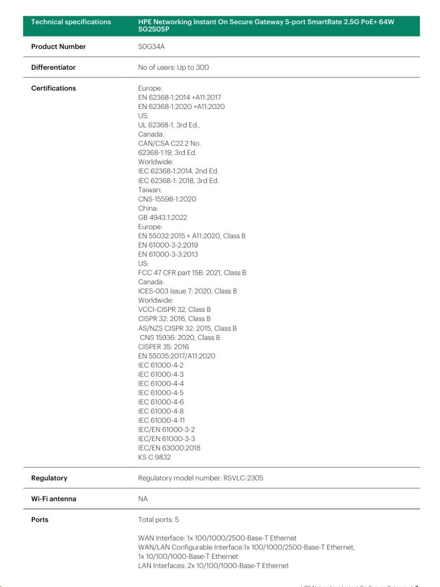 Pre väčšie prostredia ponúka HPE Networking Instant On Secure Gateway SG2505P päť portov, z ktorých dva poskytujú podporu pre multimediálne gigabity. Jeden multi-gig uplink (WAN), jeden multi-gig konfigurovateľný port (WAN/LAN), jeden gig konfigurovateľný port (WAN/LAN) a dva gig porty (LAN). SG2505P má podporu PoE s celkovým rozpočtom energie 64W na napájanie sieťových zariadení, ako sú Instant On prístupové body. S throughputom firewallu 2,3 Gbps je táto brána ideálna pre podniky, ktoré vyžadujú viac ako 1 gigabit celkovej priepustnosti od ISP. Či už ste malý obchod, ktorý chce udržať sieť jednoduchú, alebo start-up zameraný na AI s veľkými dátovými záťažami, SG2505P vám pomôže zostať pripojení a zabezpečení.