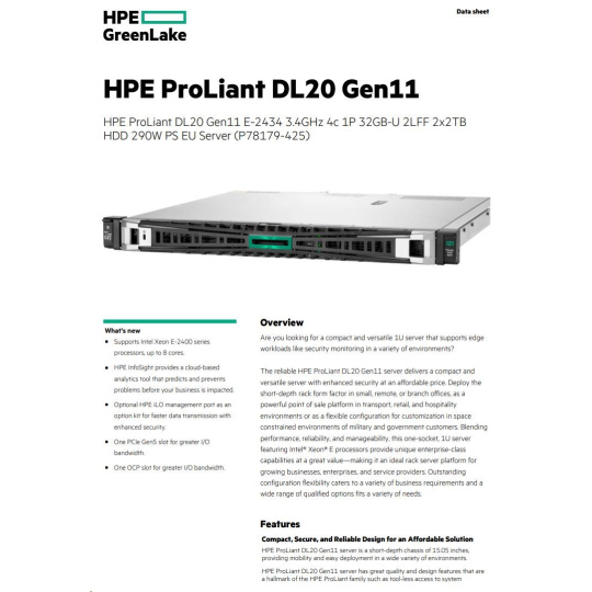 HPE PL DL20g11 E-2434 (3.4G/4C) 1x32G 2x2TB/7.2k SATA VROC 2LFF-HP 290W Smart Choice.