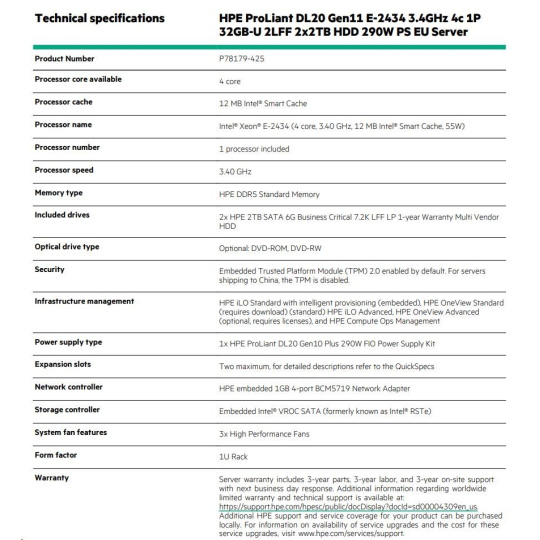 HPE PL DL20g11 E-2434 (3.4G/4C) 1x32G 2x2TB/7.2k SATA VROC 2LFF-HP 4x1Gb 290W Smart Choice