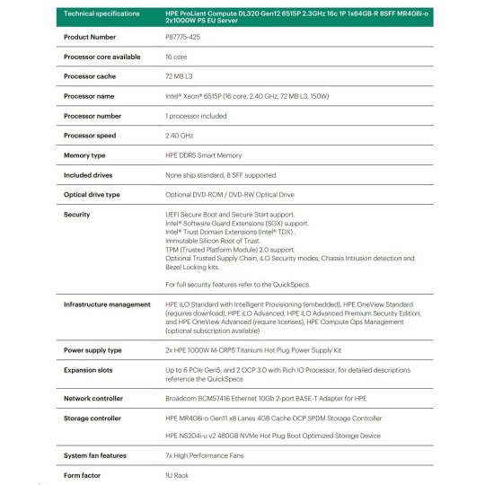 HPE PL DL320g12 6515P (2.4/16C) 1x64G (P69728) MR408i-o 8SFF NS204(2x480G) 2x1000W 10GbE NBD333 Smart Choice