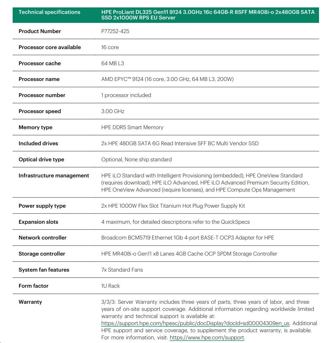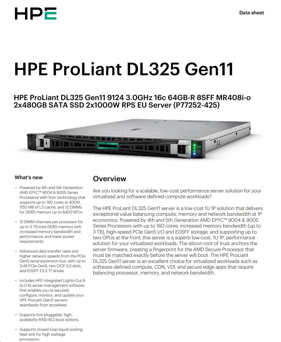 HPE ProLiant DL325 Gen11 9124 3.0GHz 16c 64GB-R 8SFF MR408i-o 2x480GB SATA SSD 2x1000W RPS EU Server