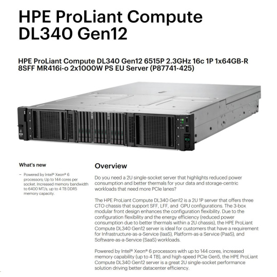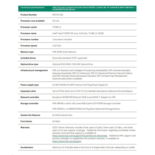 HPE PL DL340 Gen12 6515P (2.4/16C) 1x64G (P69728) NS204(2x480) MR416i-o 8SFF 2x1000W 10GbE NBD333 Smart Choice.