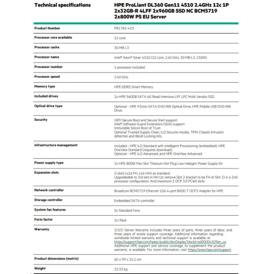 HPE PL DL360g11 4510 (2.4G/12C) 2x32G 2x960G VROC 4LFF LPC 2x800W 4x1G Smart Choice.