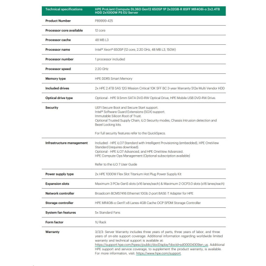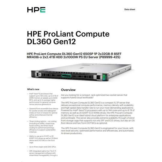 HPE PL DL360g12 6505P (2.2G/12C) 2x32G (P69727) 2x2.4TB MR408i-o 8SFF 2x1000W 2p10GbE NBD333 Smart Choice.