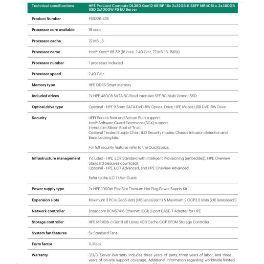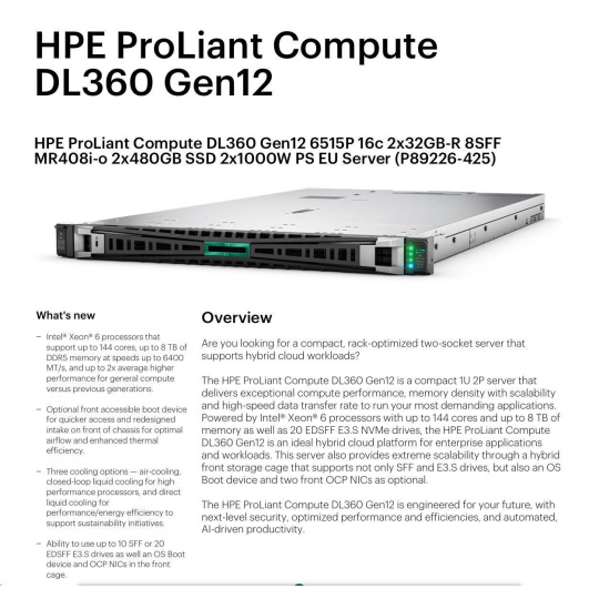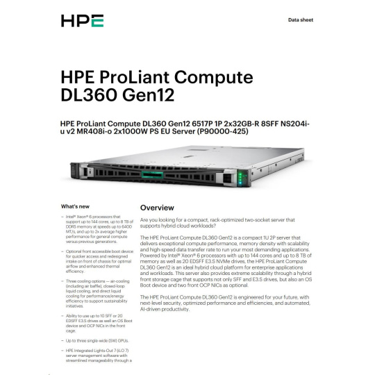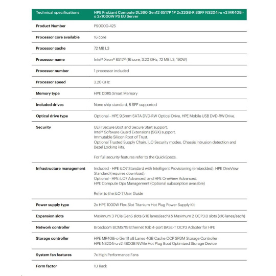 HPE PL DL360g12 6517P (3.2/16C) 2x32G (P69727) NS204 (2x480) MR408i-o 8SFF 2x1000W 4p1G NBD333 Smart Choice.