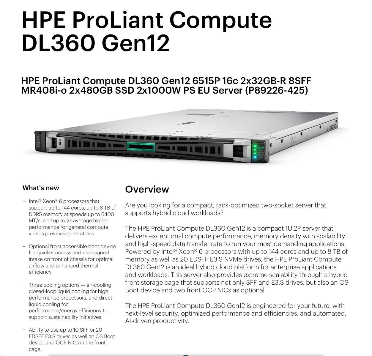 HPE PL DL360g12 6517P (3.2/16C) 2x32G (P69727) NS204 (2x480) MR408i-o 8SFF 2x1000W 4p1G NBD333 Smart Choice.
