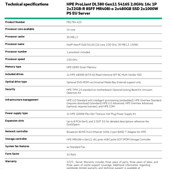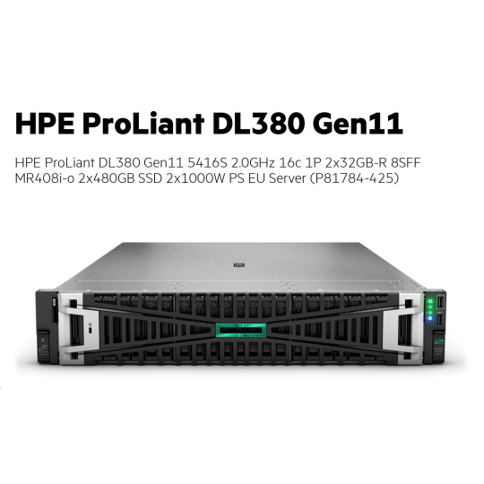 HPE PL DL380g11 5416S (2.0/16C) 2x32G (P43328) 2x480G MR408i-o/4G 8-26SFF 2x1000W 2x10G-T 2U Smart Choice