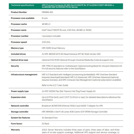 HPE PL DL380g12 6507P (3.5/8C) 2x32G (P69727) 2x480G MR408i-o 8SFF 2x1000W 10GbE NBD333 Smart Choice