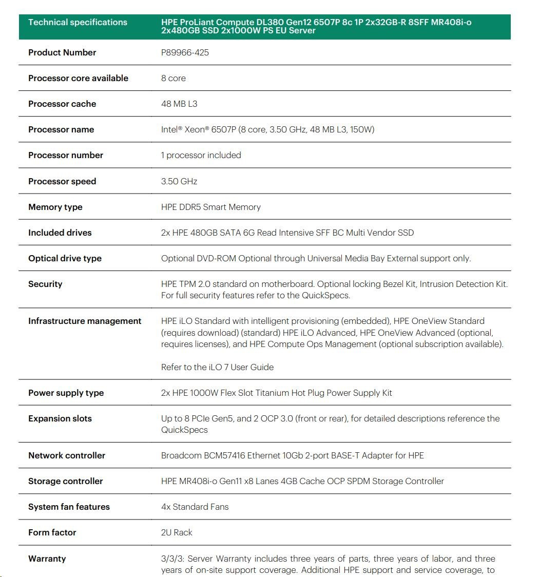 HPE PL DL380g12 6507P (3.5/8C) 2x32G (P69727) 2x480G MR408i-o 8SFF 2x1000W 10GbE NBD333 Smart Choice
