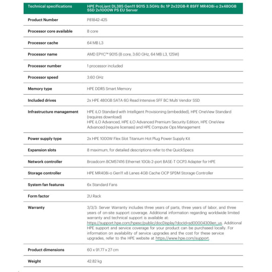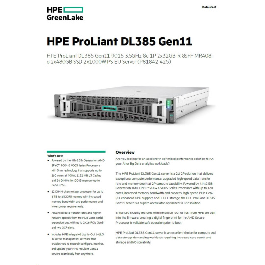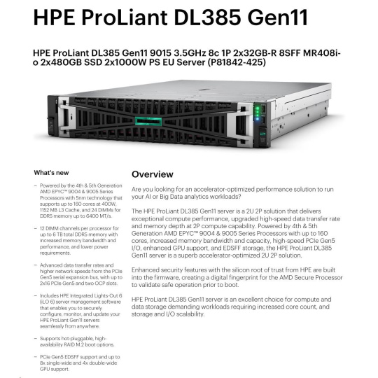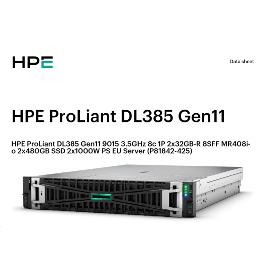 Technical specifications HPE ProLiant DL385 Gen11 9015 2.6GHz 8c 1P 2x32GB-R 8LFF HPE MR408i-o 2p10Tocp 2x1000W PS EU