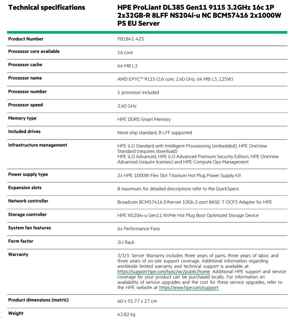 Technical specifications HPE ProLiant DL385 Gen11 9115 2.6G 16c 1P 2x32GB-R 8LFF NS204i-u NC BCM57416 2x1000W PS EU