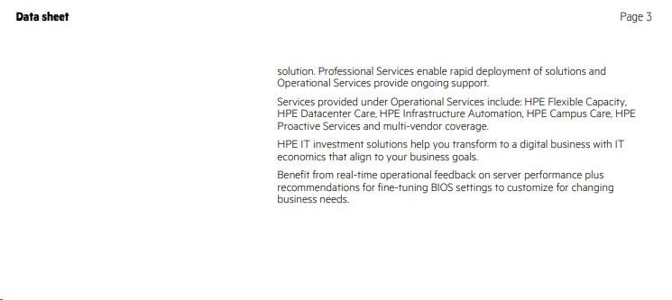 | Management | HPE iLO Standard with Intelligent Provisioning (embedded), HPE OneView Standard (requires download); HPE iLO Advanced and HPE OneView Advanced (require licenses) |