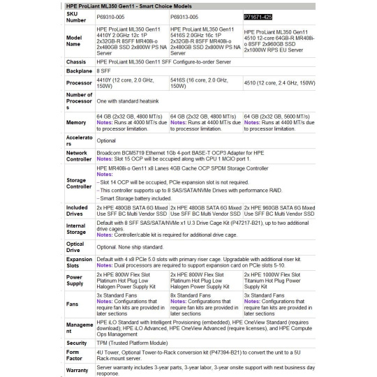 Model Name HPE PL ML350g11 4510 (2.4G/12C) 2x32G 2x960G 2x1000W MR408i-o 8-24SFFU3