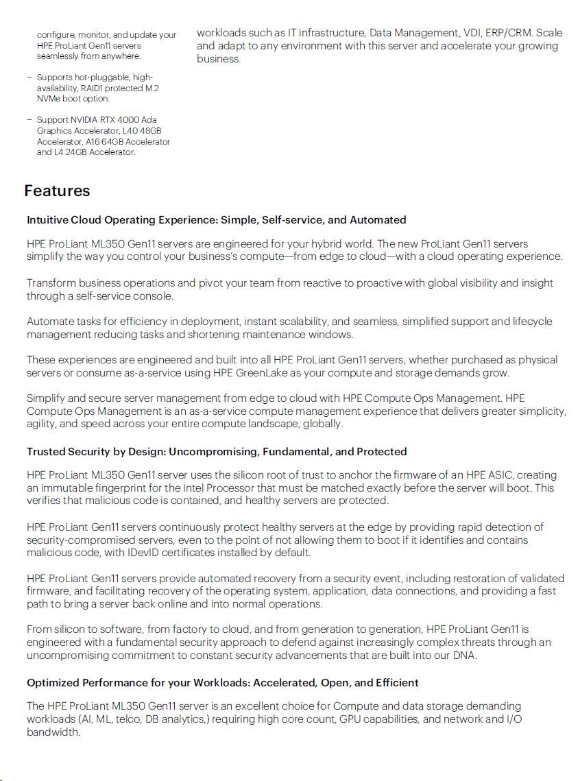| Management | HPE iLO Standard with Intelligent Provisioning (embedded), HPE OneView Standard (requires download); HPE iLO Advanced, HPE OneView Advanced (require licenses), and HPE Compute Ops Management |