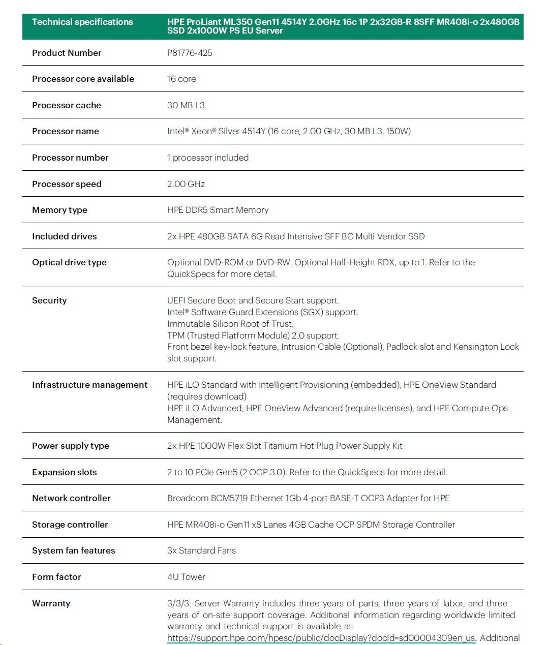 | Model Name | HPE ProLiant ML350 Gen11 4514Y 2.0GHz 16c 1P 2x32GB-R 8SFF MR408i-o 2x480GB SSD 2x1000W PS EU Server |