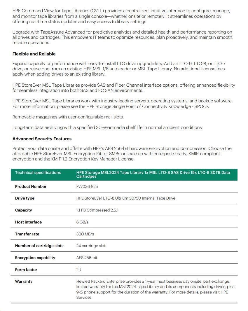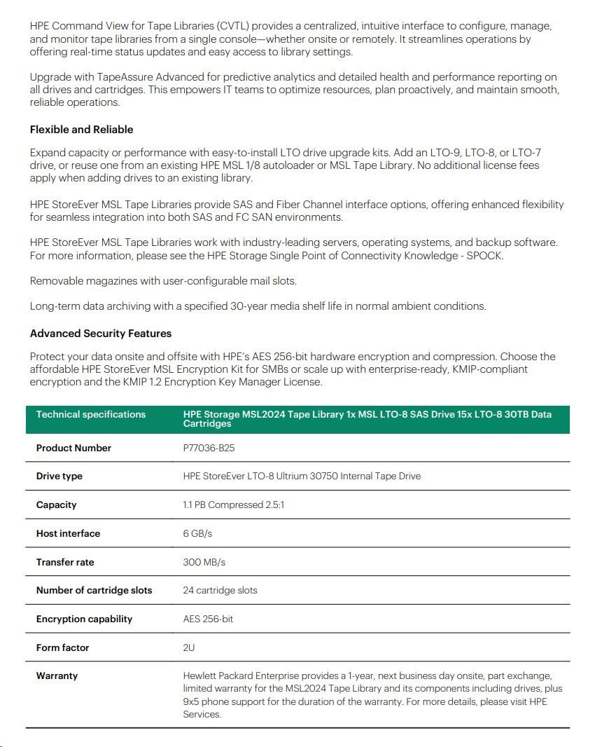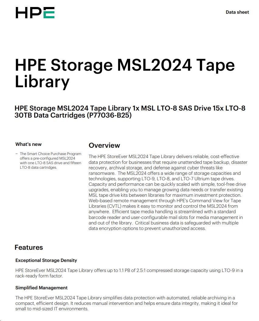 HPE Storage MSL2024 TapeLibrary (AK379A+LTO8SASDriveQ6Q68A+15xQ2078A LTO8 30TBDataCartridges+Q2015ABarCodeLabelPack) SC