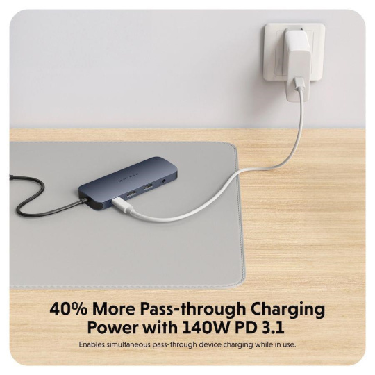 Rýchly a spoľahlivý gigabitový ethernet poskytuje vysokorýchlostné a spoľahlivé káblové pripojenie na internet, čo umožňuje rýchlejší prenos dát, plynulé streamovanie videa a lepšie zážitky pri hraní online hier. Čas sú peniaze, a preto vám prichádza na pomoc USB-C Hub Hyper EcoSmart™ druhej generácie. Tento dátový šprintér posunie vašu prácu na vyššiu úroveň.Priepustné nabíjanie pomocou USB-C Power Delivery 140 W PD 3.1