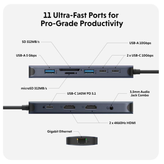 .Hyper® EcoSmart™ Gen.2 Dual HDMI USB-C 11-in-1 Hub 140W PD 3.1 Pass-thru