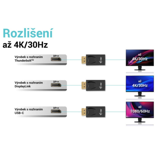 - V prípade DisplayPortu s DisplayLinkom bude maximálne rozlíšenie 4K / 30 Hz (napríklad dokovacie stanice i-tec alebo videoadaptéry s číslom produktu začínajúcim CAxxxxxxxxx).