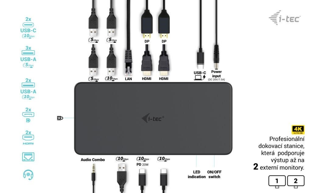 Výkonná kancelárska dokovacia stanica podporujúca superrýchle porty USB Gen 2 s rýchlym nabíjaním. Dokovacia stanica podporuje výstup až na dva externé monitory vo vysokom rozlíšení až 4K. Stanicu je možné prakticky použiť so všetkými notebookmi, pretože podporuje pripojenie ku všetkým bežným portom: 3.0, USB-C a Thunderbolt“ 3/4 a zároveň podporuje všetky bežné súčasné operačné systémy.