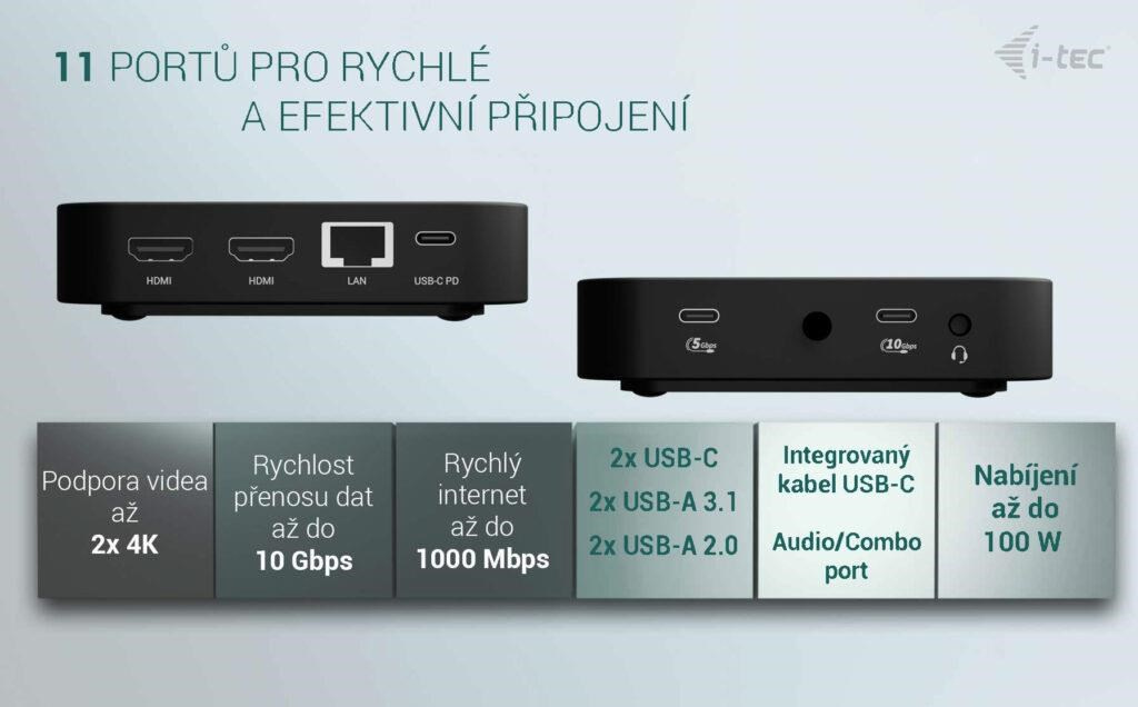 Moderná USB-C dokovacia stanica pre kancelárske použitie s podporou až dvoch externých monitorov v rozlíšení 4K. Stanica je kompatibilná s akýmkoľvek notebookom vybaveným portom USB-C, USB4 alebo Thunderbolt 3/4/5. Ponúka 6 USB portov, spoľahlivé a rýchle pripojenie k firemnej sieti vďaka integrovanému LAN portu a možnosť inštalácie za monitor, čo z nej robí ideálneho partnera pre profesionálne použitie. Samozrejmosťou je aj schopnosť nabíjať notebook alebo tablet výkonom až 100 W.