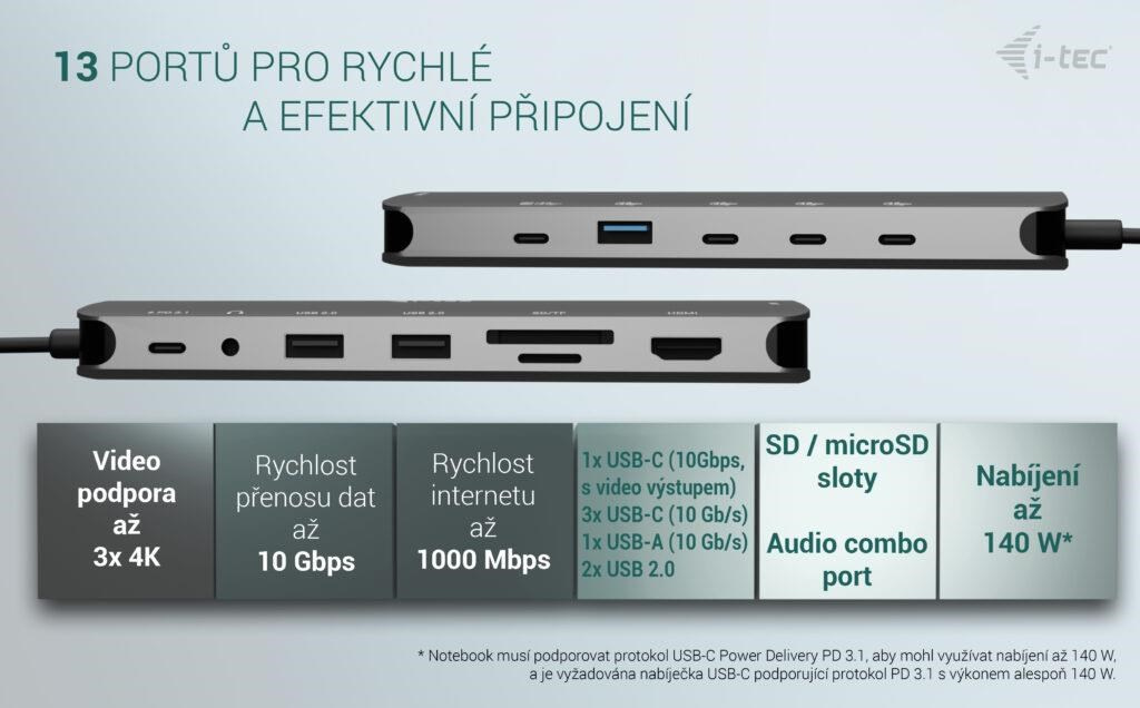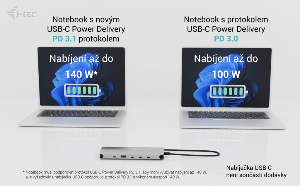 ** Ak váš notebook alebo tablet podporuje nový a moderný nabíjací protokol USB-C Power Delivery PD 3.1, dokovacia stanica ponúkne nabíjaciu výkon až 140 W (ak používate protokol PD 3.0, nabíjací výkon bude až 100 W).