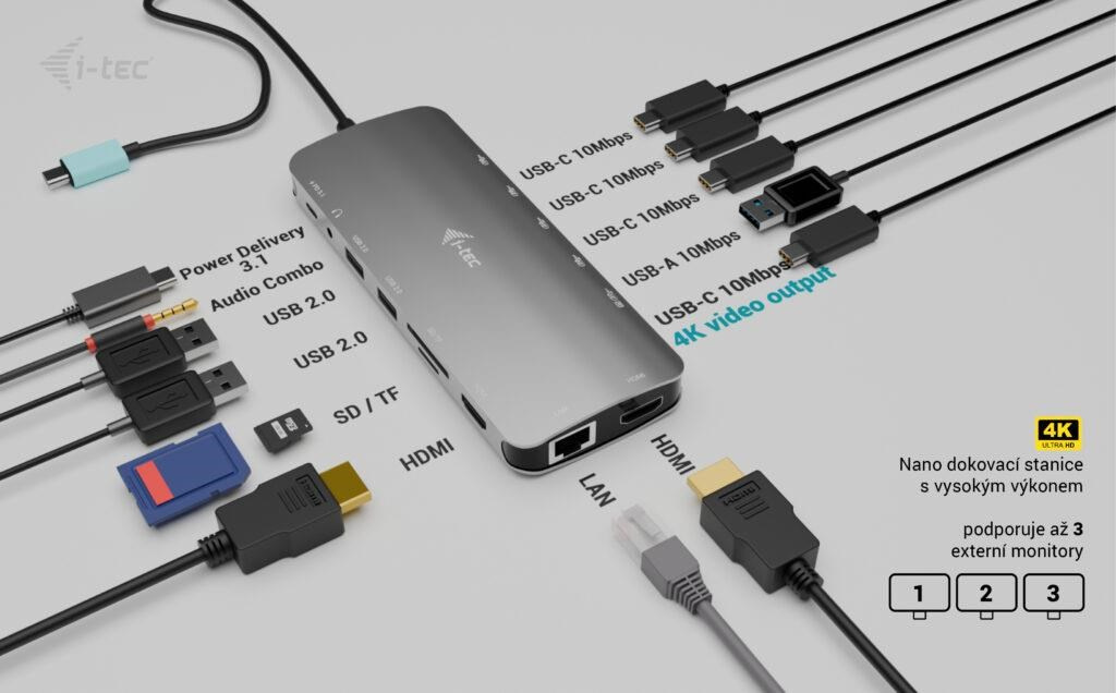 - Malá, ale výkonná kovová dokovacia stanica USB-C, do ktorej je možné pripojiť až tri externé monitory