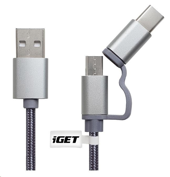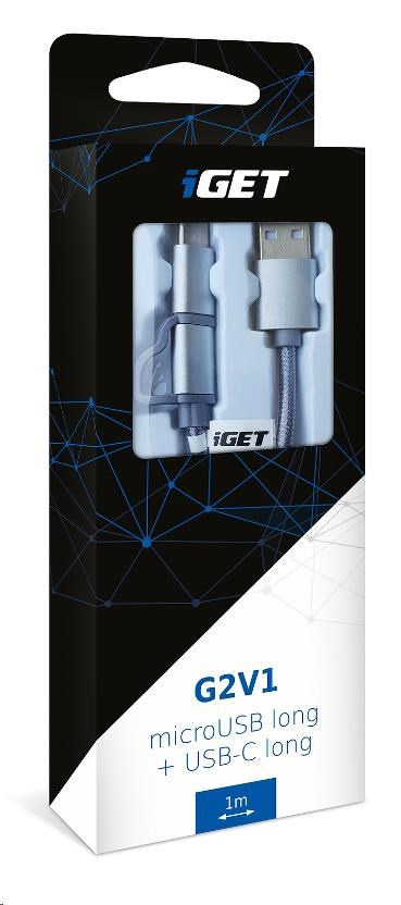 iGET G2V1 USB kábel 2v1, 1 m, strieborný, microUSB a USB-C, predĺžené konce