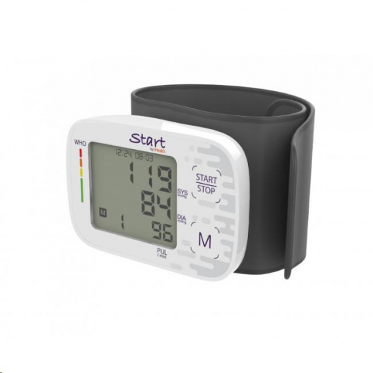 Tlakoměr měří aktuální hodnoty systoly, diastoly a tepu pohodlně na zápěstí ruky. Upozornění na nepravidelný srdeční rytmus a stupnice hodnocení krevního tlaku podle doporučení WHO vám pomůže lépe pečovat o vaše zdraví.