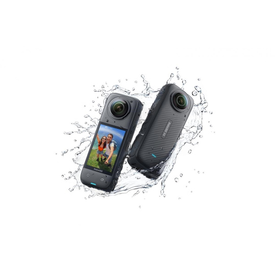 Akčná 360° kamera Insta360 X4 so snímačom 1/2''. Rozlíšenie 360° videa je 8K / 30fps, pri 4K až 100 fps. Fotografie s rozlíšením až 72 Mpx. Kvalitná robustná konštrukcia, veľký dotykový 2,5“ displej, vodotesná do 10 m. Účinná stabilizácia FlowState s 6- osým gyroskopom. Nová batéria s veľkou kapacitou 2290 mAh. Ovládanie gestami, hlasové ovládanie 2.0. Video režimy Video, Active HDR, Timelapse, TimeShift, Bullet Time, Loop Recording, Pre-recording. Rozmery kamery: 46 x 123,6 x 37,6 mm