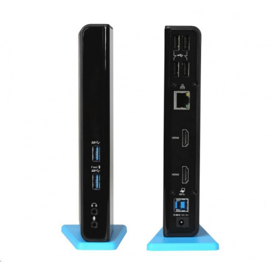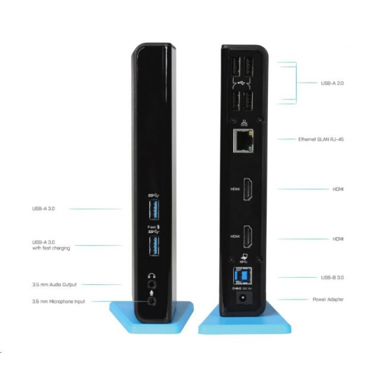 Stanica podporuje až 2x externý monitor, ktorý môžete pripojiť cez porty HDMI. 6x port USB, spoľahlivé a rýchle pripojenie k internetu vďaka integrovanému portu LAN a podpora zvukového vstupu a výstupu.