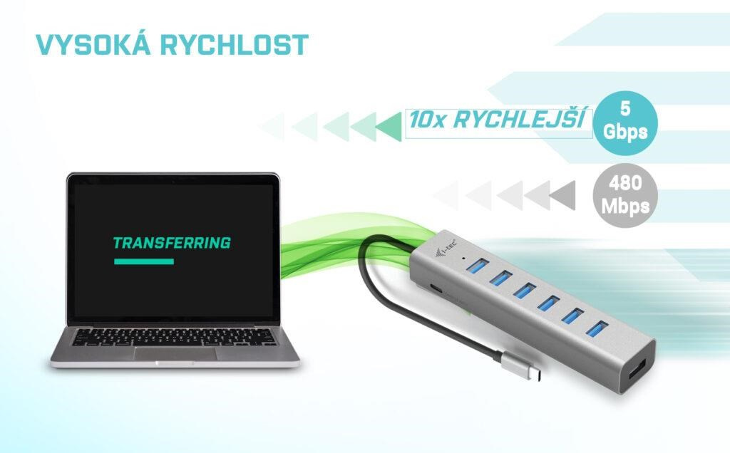S týmto hubom získate ďalších 7 USB 3.0 portov (až 5 Gbps). Pripojte si externú klávesnicu a myš, prenášajte dáta alebo filmy z USB flash disku rýchlosťou až 5 Gbps alebo nabíjajte svoje mobilné zariadenia rýchlosťou až 7.5W.