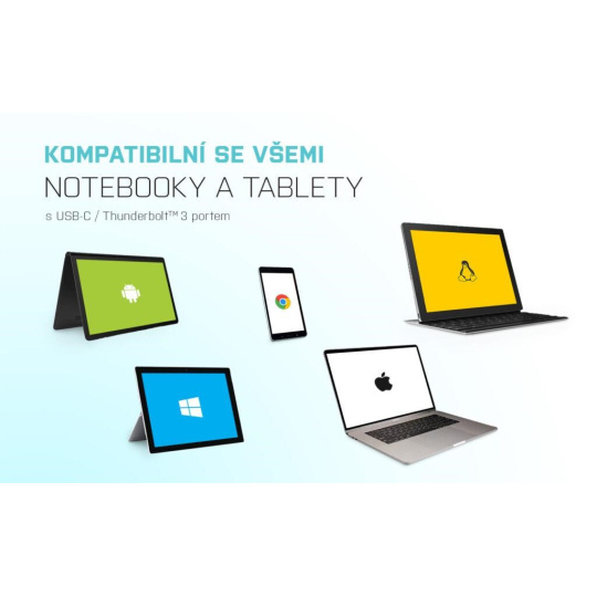 OS: Vyžaduje USB-C rozhraní s podporou “DisplayPort Alternate Mode” (ne všechna zařízení / systémy s rozhraním USB-C mají tento standard) nebo Thunderbolt 3 port – nyní Windows 10 32/64bit, Mac OS X, Chrome OS (Google)