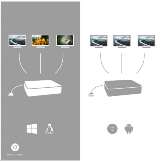 1/ Operačný systém macOS nepodporuje technológiu Multi Stream Transport (MST), čo znamená, že po pripojení k systému macOS sa na všetkých pripojených monitoroch bude premietať rovnaký obraz.