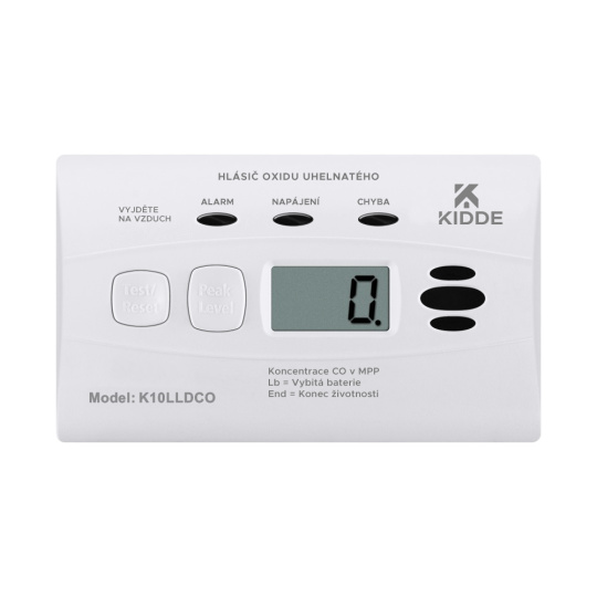 Detektor CO, měřící zařízení Kidde 10LLDCO, odolný proti vlhkosti s de-ionizovaným vodním elektrolytem, který provádí testování každou vteřinu na smrtelné nebezpečí v podobě oxidu uhelnatého. Novou funkcí tohoto nejnovějšího detektoru CO s produkce výrobce Kidde je LED indikátor, který v případě poruchy nebo nízké kapacity bateriového zdroje žlutě bliká a tak doplňuje odpovídající grafickou informaci zobrazenou na LCD panelu doprovázenou varovným akustický signálem a speciální zámek, jehož cílem je zabránění odstranění zařízení instalovaného na stěnu dětmi nebo nepovolanými osobami.
