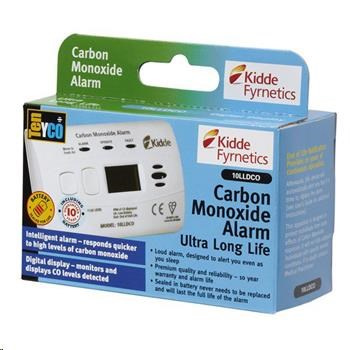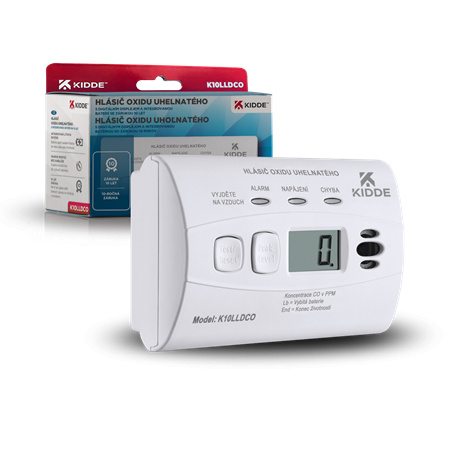 Detektor CO, měřící zařízení Kidde 10LLDCO, odolný proti vlhkosti s de-ionizovaným vodním elektrolytem, který provádí testování každou vteřinu na smrtelné nebezpečí v podobě oxidu uhelnatého. Novou funkcí tohoto nejnovějšího detektoru CO s produkce výrobce Kidde je LED indikátor, který v případě poruchy nebo nízké kapacity bateriového zdroje žlutě bliká a tak doplňuje odpovídající grafickou informaci zobrazenou na LCD panelu doprovázenou varovným akustický signálem a speciální zámek, jehož cílem je zabránění odstranění zařízení instalovaného na stěnu dětmi nebo nepovolanými osobami.