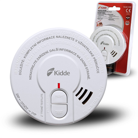 Hlásič požáru je vybaven testovacím tlačítkem TEST pro kontrolu správného fungování zařízení a HUSH pro přechodné umlčení požárního hlásiče pro případ planého alarmu. Stisknutí tlačítka způsobí okamžitou deaktivaci alarmu, na dobu asi 10minut, snížení citlivosti obvodů a vypnutí akustické signalizace hlásiče. Tlačítko HUSH používejte pouze tehdy, pakliže znáte příčinu aktivace hlásiče (např. při vaření nebo smažení). Po cca 10 minutách od deaktivace hlásiče se tento zcela automaticky resetuje do původního nastavení pro monitorování nebezpečí požáru. Pokud v místnosti zůstane vysoká koncentrace kouře, můžete stisknout tlačítko HUSH opakovaně a to až do okamžiku kdy je místnost řádně odvětrána. Tento model je vybaven nejmodernějším fotoelektrickým senzorem Kidde.