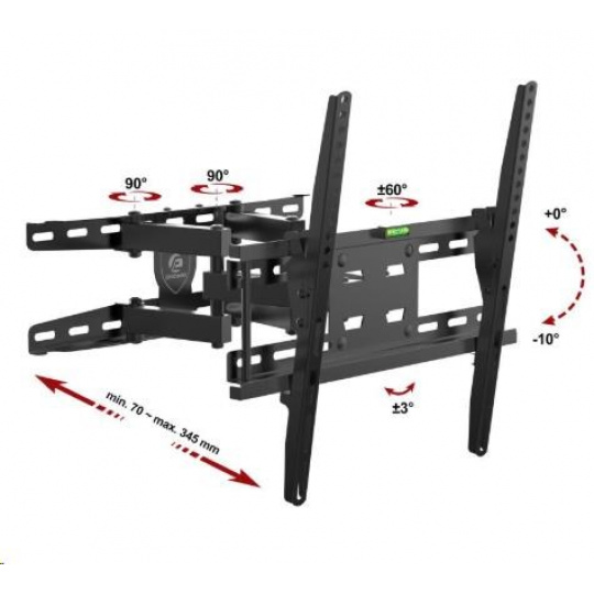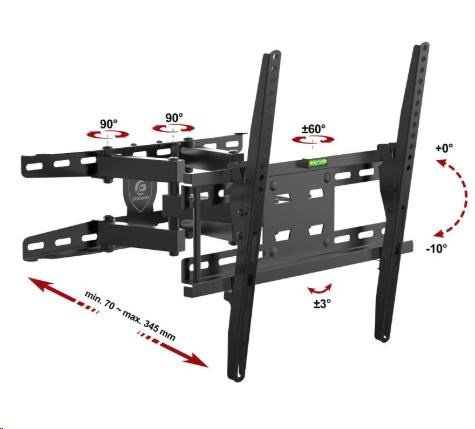 Technické údaje: nosnosť 35kg vhodný na zavešenie LED, OLED, QLED, LCD televízorov s uhlopriečkou 26" až 55" podporuje VESA štandardy (VESA normy) 200x100 až 400x400 nastaviteľná vzdialenosť od steny v rozmedzí 70 až 345 mm otáčanie do strán +/- 60° náklon 0° až -10° korekcia roviny +/- 3° integrovaná vodováha, inštalačný materiál spoľahlivá, bezpečná oceľová konštrukcia farebné prevedenie čierne záruka 3 roky Držiak LED, OLED, QLED a LCD televízie Ergosolid REDOX-K35 podporuje tieto VESA štandardy pre uchytenie TV: VESA 200x100 VESA 200x200 VESA 300x200 a 200x300 VESA 300x300 VESA 400x100 VESA 400x200 a 200x400 VESA 400x300 a 300x400 VESA 400x400 Závesný systém - držiak Ergosolid REDOX-K35 je vhodný na zavešenie všetkých typov a veľkostí televízorov, ktoré majú hmotnosť do 35kg a podporujú ktorýkoľvek z vyššie uvedených VESA štandardov. Uvádzané veľkosti a typy televízorov sú iba orientačné - držiak je možné použiť aj na väčšie televízory.