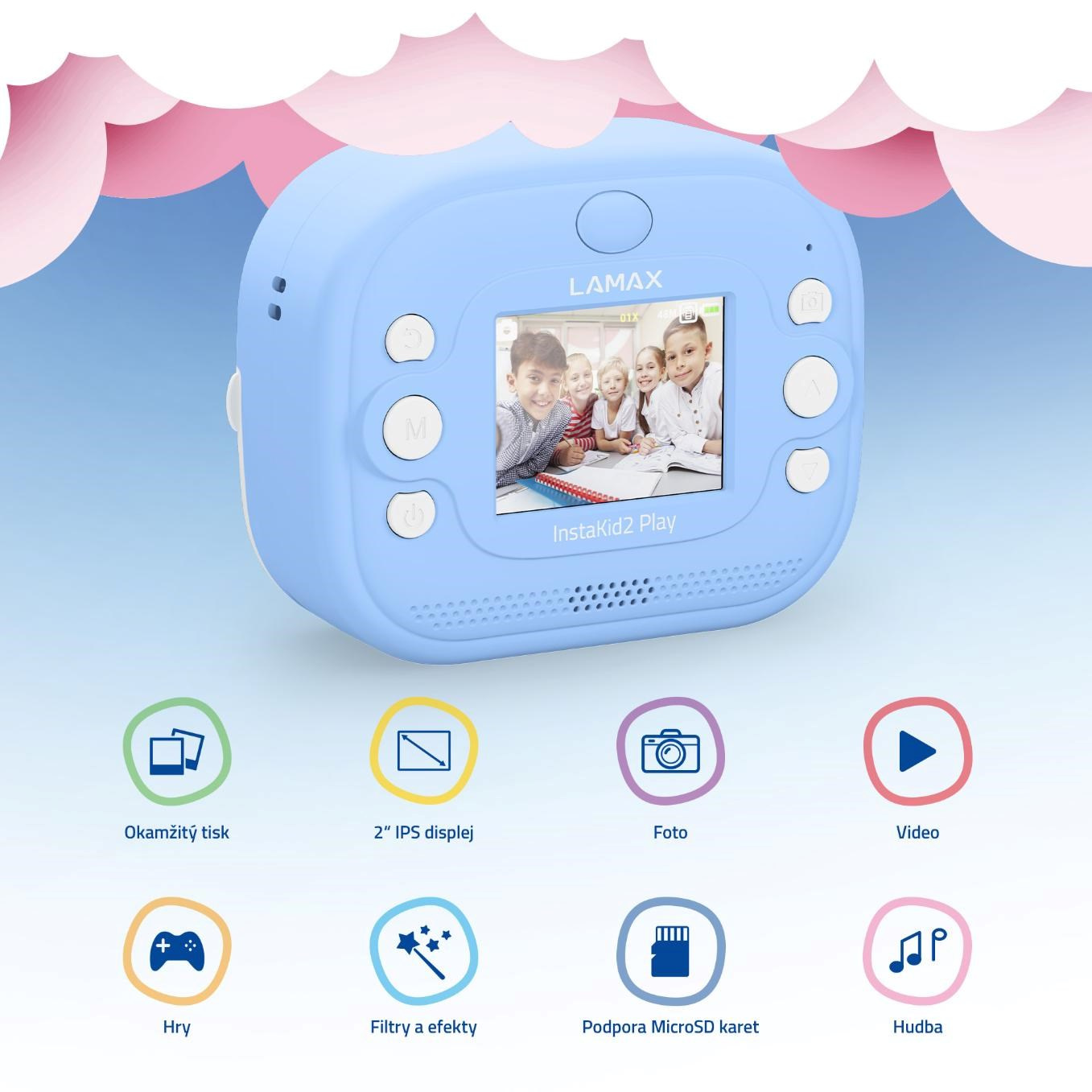 LAMAX InstaKid2 Play je foťák, ktorý nestráca čas. Deti si s ním jednoducho zaznamenajú každý dôležitý moment a počas sekundy ho majú v ruke. Čiernobiele snímky sa môžu premeniť na farebné spomienky pomocou fixiek, ktoré sú súčasťou balenia – stačí ich len vyfarbiť, pridať do vlastného albumu alebo nimi potešiť napríklad babičku. Vďaka jednoduchému ovládaniu, dvom ruličkám v balení (vrátane samolepiacej), originálnemu dizajnu a výkonnej kamere so 48 Mpx a FullHD videom, sa foťák stane nepostrádateľným spoločníkom na výlety, oslavy aj tvorivá popoludní s kamarátmi. Obľúbia si ho aj staršie deti, ktoré si môžu svoje snímky aj videá ukladať na microSD kartu a uchovať si tak svoje prvé filmárske pokusy. Na výber je ružová alebo modrá varianta a nechýba ani praktická šnúrka na krk, aby mali deti foťák stále po ruke. A keď práve nefotí? Zábavu zaistí päť hier priamo vo fotoaparáte. Tento foťáčik totiž nie je len o spomienkach, je tiež o radosti, sebavyjadrení a fantázii.