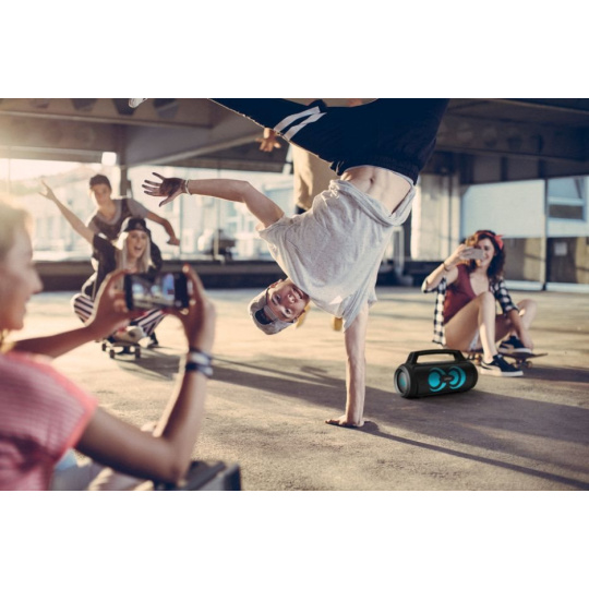 Mať pripravený vlastný výber party songov je top, ale keď musíš improvizovať, hodí sa aj možnosť naladiť FM rádio a svoju obľúbenú stanicu. Ktorúkoľvek akciu si môžeš skúsiť aj odmoderovať vďaka pribalenému mikrofónu, ktorý je parádnou výbavou aj pre karaoke. 3 režimy LED podsvietenia na prednom paneli ešte dotvoria atmošku. Svoj playlist potom spustíš cez Bluetooth 5.3, ktorý sa spáruje s rôznymi zariadeniami a je zárukou kvalitného prenosu až na 18 m. Alebo môžeš využiť USB, microSD kartu, prípadne kábel.