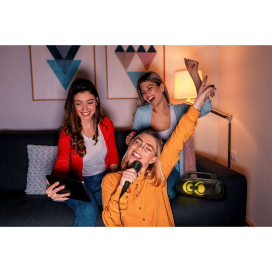 Ovládnite každú party. Súčasťou balenia reproduktora je mikrofón umožňujúci moderovanie alebo organizáciu karaoke, kedy si môžete zaspievať so svojimi idolmi. Hlasitosť si ľahko nastavíte.