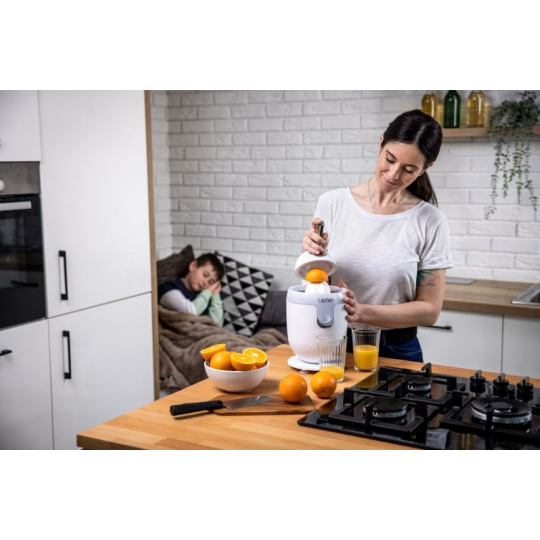 Provoz citrusovače je natolik tichý, že můžete připravit rodině k snídani čerstvý džus, aniž byste přitom vzbudili celou rodinu. Přístroj se stane také krásným doplňkem interiéru kuchyně díky svému čistému elegantnímu designu. Opomíjena není ani bezpečnost, tu zajišťují protiskluzové nožičky a pojistka zabraňující spuštění, pokud není lis správně sestaven.
