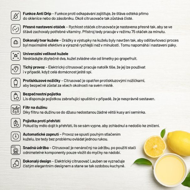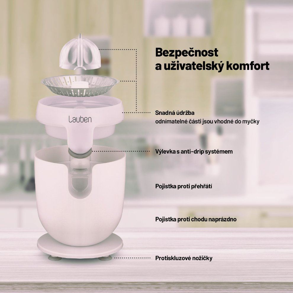 Šťáva plná vitamínů snadno a rychleVyznavačům zdravého životního stylu nesmí doma chybět pomocník v podobě elektrického citrusovače Lauben Electric Citrus Juicer 110WT. Jeho čistý design ozdobí každou kuchyňskou linku, kterou díky funkci Anti Drip nepotřísní ani kapka šťávy. Funkce proti odkapávání zajišťuje, že džus odtéká přímo do sklenice či zůstává v zásobníku. Rychlost otáček při odšťavňování je nastavena tak, aby si šťáva uchovala maximum vitamínů. Chuť navíc není nijak ovlivněna, neboť části dotýkající se ovoce jsou nerezové či z plastu splňujícího nejpřísnější nařízení EU a neuvolňují tak žádnou pachuť ani aroma. Tvar kužele a nastavení páky proces odšťavňování zefektivňují a tichý provoz umožňuje přípravu džusu v jakoukoliv hodinu. Bezpečný provoz zajišťují protiskluzové nožičky a pojistka zabraňující spuštění, není-li lis správně sestaven. Jistě potěší i snadná údržba, odnímatelné části stačí vložit do myčky.