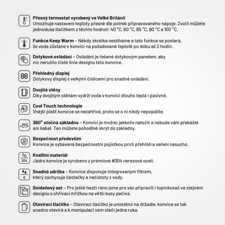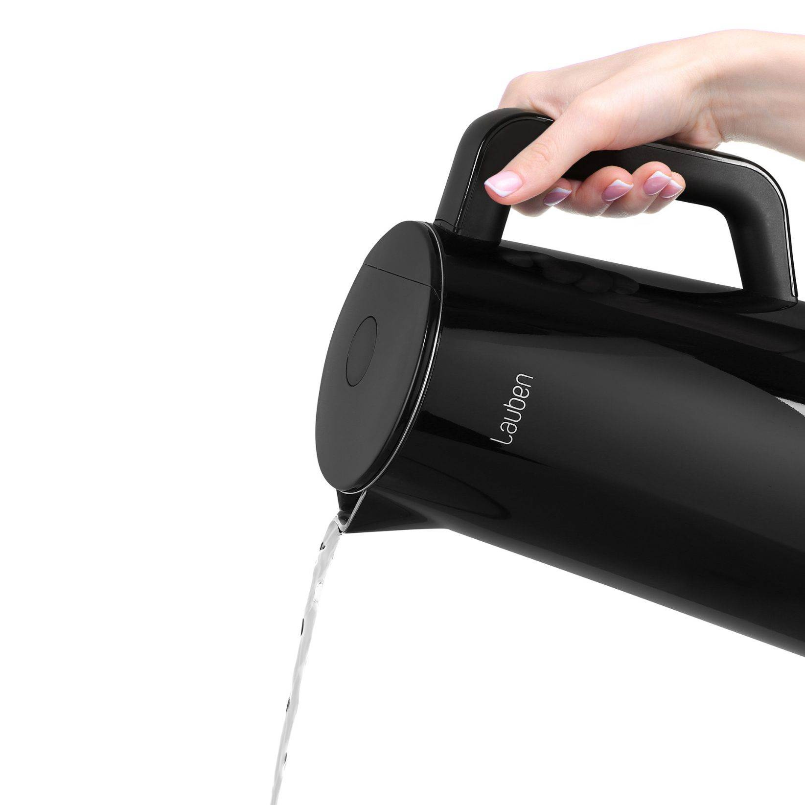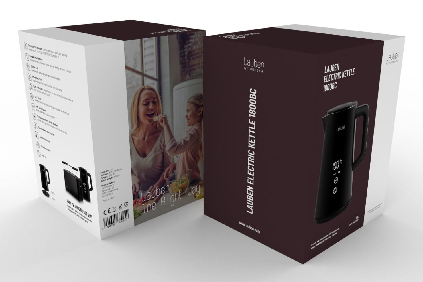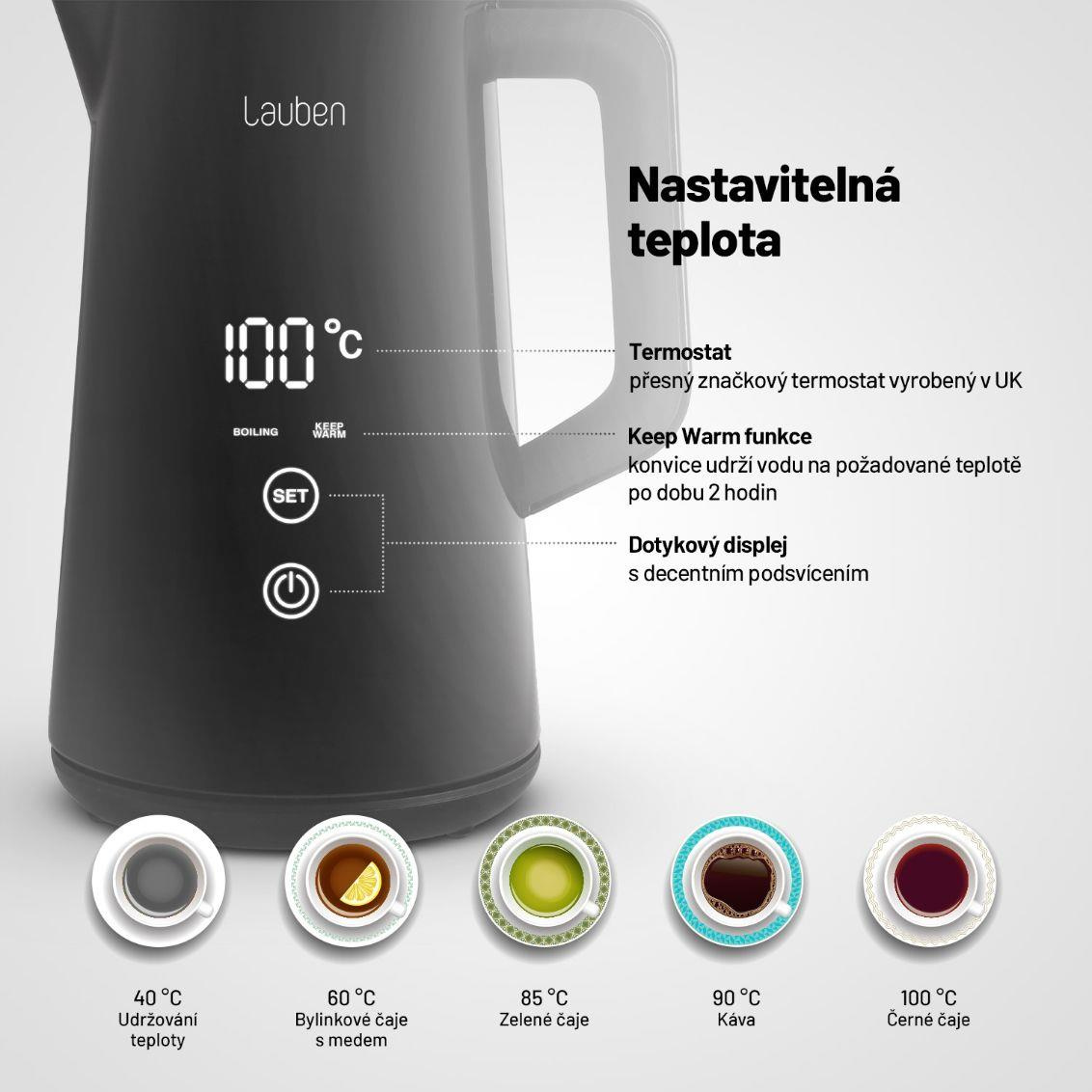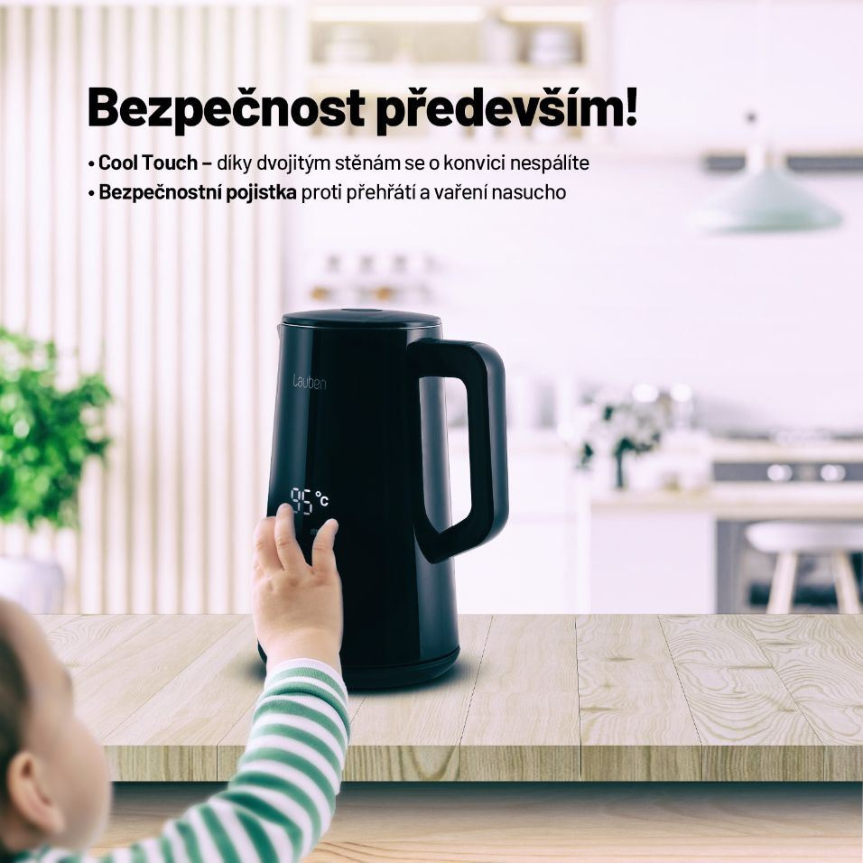 Voda přesně na míru nápojůmNepostradatelnou součástí kuchyní se stala rychlovarná konvice. I ta ale může být víc než jen užitečný domácí spotřebič. Lauben Electric Kettle 1800BC v dokonalém černém designu s velkým digitálním displejem je velmi praktická a zároveň působí jako stylový designový doplněk. Vodu v ní ohřejete přesně na požadovanou teplotu a díky přesnému termostatu a funkce Keep Warm ji udrží na stejné teplotě až po dobu 2 hodin. Ani pak jí však dvojité stěny nedovolí rychle zchladnout. Údržba konvice je snazší než kdy dřív, integrovaný filtr totiž zachytí mnohé nečistoty. Jako vždy myslíme i na bezpečnost, proto technologie Cool Touch zabraňuje popálení se o konvici a bezpečnostní pojistka přístroj ochrání proti přehřátí a vaření bez vody. Samozřejmostí je základna otočná o 360° s prostorem pro ukrytí kabelu.