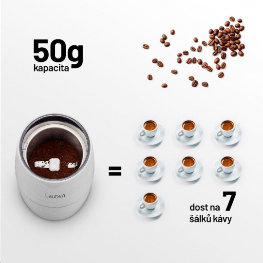 Dokonale pomletá káva, orechy alebo korenieLauben Grinder 200ST je skvelým pomocníkom pre všetkých milovníkov kvalitnej kávy. Mlýnek je vybavený silným celomedeným motorom, ktorý pracuje pri príkone 200 W a má dlhšiu životnosť. S týmto mlýnkom si rýchlo poradíte až s 50 g kávových zŕn, ale aj orechov, semienok alebo byliniek. Sekacie nožnice tríštivého typu z nerezovej ocele #304 zabezpečí rovnomerné mletie surovín. Mlýnek sa ovláda stlačením pulsného spínača na viečku, hrubosť pomletia surovín tak môžete ľahko regulovať. Pre hrubo pomletú kávu alebo orechy stačí kratšia doba mletia, pre dokonale jemnú kávu nechajte mlýnek pracovať dlhšie. Priebeh mletia budete mať celú dobu pod kontrolou vďaka priehľadnému viečku. Telo mlýnku a mlielna nádoba sú vyrobené z #304 nerezovej ocele, ktorá uchová jedinečné aróma čerstvo pomletých káv po celú dobu prípravy. Za nezameniteľnou vôňou už nemusíte ráno vrhať do obľúbenej kaviarne. Mlýnek sa ovláda veľmi jednoducho jednou rukou a na spustenie stačí zatvoriť a stlačiť viečko. Tento spôsob obsluhy je zároveň veľmi bezpečný, pretože mlýnek sa nikdy nezapne otvorený. Samozrejmosťou je poistka proti prehriatiu. Teší vás určite aj veľmi tichý chod a elegantný minimalistický dizajn, ktorý z mlýnku urobí deco každej kuchyne.