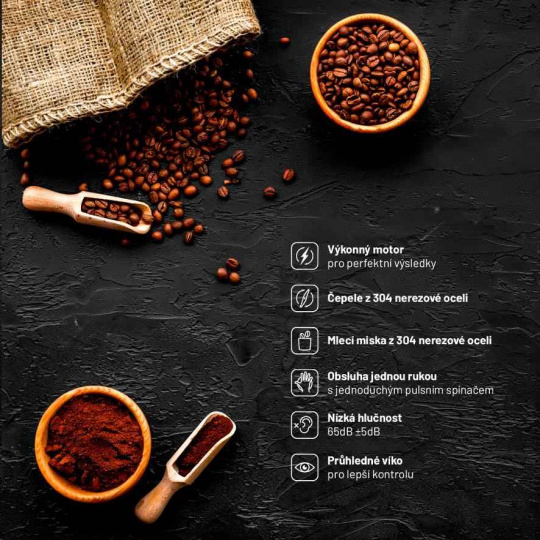 Aby ste mlýnek uviedli do prevádzky stlačením pulsného spínača po zatvorení viečka, nemôže dôjsť k procesu mletia, ak mlýnek správne nezatvoríte. Samozrejmosťou je poistka proti prehriatiu. Mletie kávy alebo iných surovín zvládnete hravo jednou rukou a pokojne aj za svitania pred odchodom do práce. Mlýnek totiž pracuje veľmi ticho. Aj keď je vybavený veľmi silným motorom, dosahuje hluk len 65 dB, čo je približne rovnako ako bežný rozhovor.