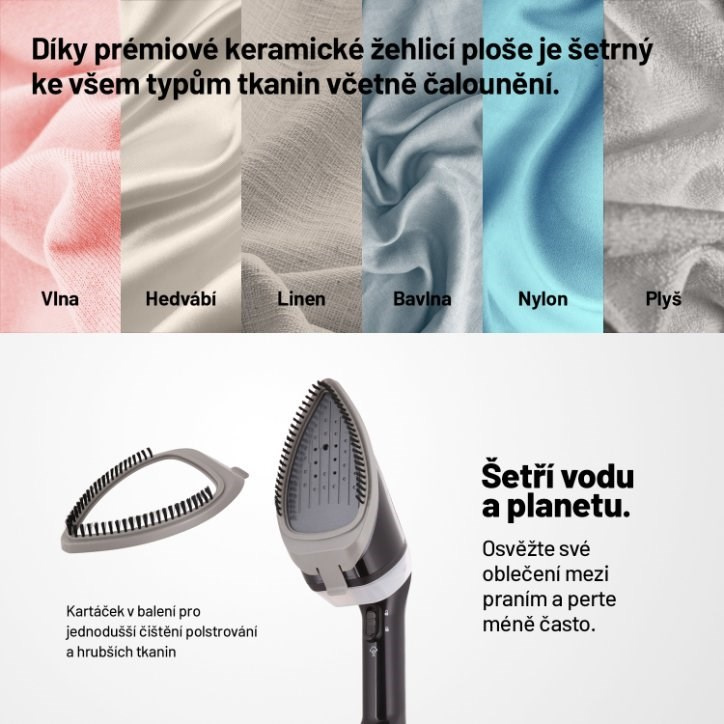 Tento napařovač kombinuje výkon žehličky se silou páry, aby okamžitě vyhladil sklady na oblečení a čalounění a zároveň zlikvidoval 99,9 procent bakterií. Oživí a zbaví zápachu i několik dnů nošené oblečení, které nemusíte tak často prát. To vše za pomoci čisté vody, bez chemikálii.