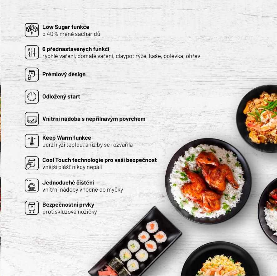 Rýžovar tvoří nádoba o objemu 1,5 litru s nepřilnavým povrchem. Příprava pokrmů tak nevyžaduje žádný přidaný tuk, a přesto se rýže ani ostatní suroviny nikdy nepřichytí. Velkou výhodou je i časovač a funkce keep warm, se kterými si můžete jídlo připravit předem nebo naopak držet několik hodin teplé, ale přitom stále perfektní. Ovládání zvládne úplně každý, vše si nastavíte na digitálním displeji, na kterém můžete sledovat průběh vaření. Potěší vás jistě i snadná údržba. Nádobu je možné mýt v myčce a vy tak nemusíte v kuchyni strávit celé odpoledne. Třešničkou na dortu je velmi povedený design, o kterém svědčí i dvě prestižní ocenění. Lauben Low Sugar Rice Cooker je ideálním pomocníkem do kuchyně právě pro vás, pokud chcete mít na talíři vždy perfektní výsledek, ale nechce se vám obětovat hodiny strávené u sporáku.